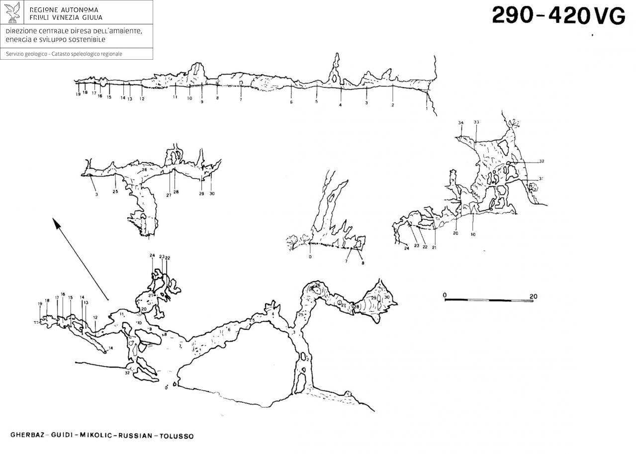 La grotta termina in corrispondenza ad uno stretto vano ascendente che si restringe sino a diventare impraticabile (p.30).