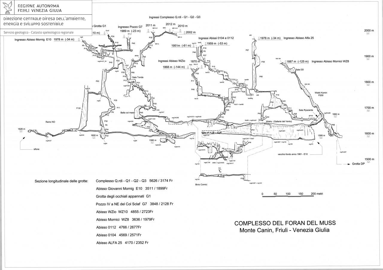 Alla base di un ampio P40, a 100m di profondità, la grotta prosegue con una serie di pozzi attivi che a -350 intercettano il vasto sistema di gallerie orizzontali del Complesso. Alla sommità del P40 s'innesta la grotta degli Occhiali Appannati che s'apre quasi sulla verticale, a 2004m di quota, e che presenta uno scarso sviluppo planimetrico. A -350 il sistema di gallerie prosegue in due direzioni. Da un lato si sviluppa il Ramo NW, interamente fossile che, dopo aver piegato bruscamente verso S, termina su di un piccolo sifone, forse pensile, che è quasi sicuramente lo stesso con cui termina l'abisso K12, cavità non legata al Complesso. Questa è la zona più occidentale di tutto il sistema. Dalla parte opposta, invece, dopo uno stretto cunicolo fangoso (sifonante nel luglio 1991!) la grotta imbocca una serie di ampie gallerie dirette prima verso N, quindi rettilinee verso E, infine verso NE, terminando in una vasta sala in frana (limite del 1981); questa si trova circa 40m più bassa del collegamento fra Mornig, WZ8, Comici e Grotta DP.