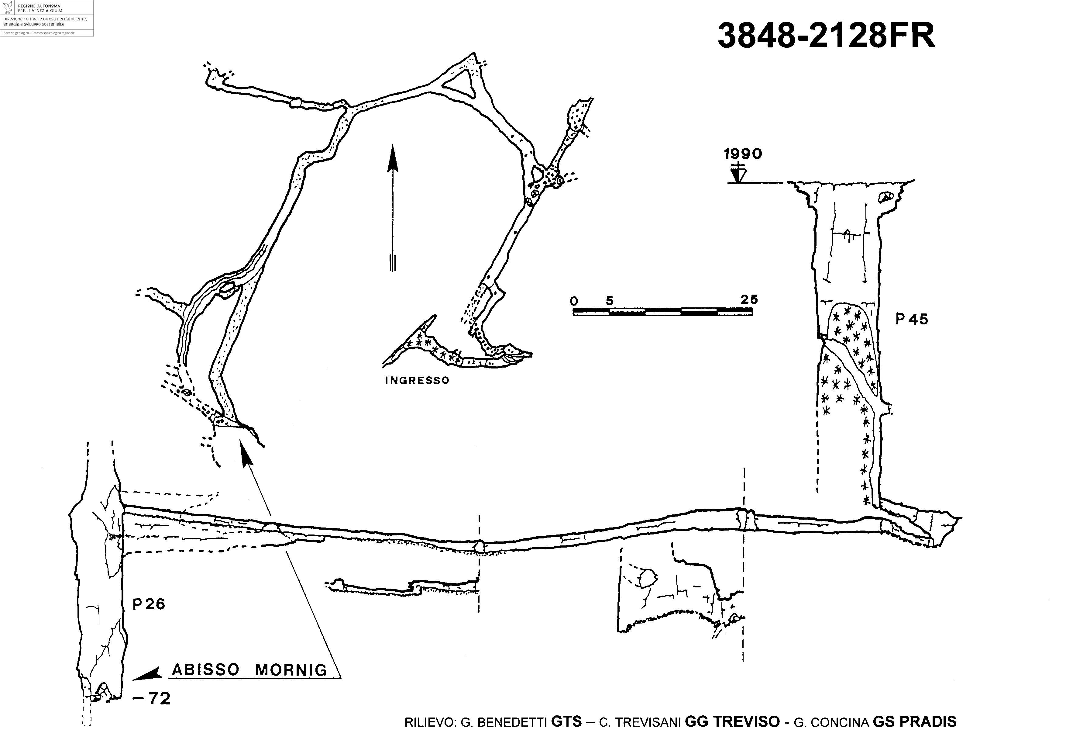 Nell'agosto 2000, passando tra neve e roccia, è stata completata la discesa del pozzo iniziale grazie alla quale è stata esplorata una serie di belle condotte che con un percorso quasi circolare sboccano sulla parete di un vasto pozzo, di 26m che porta nell'Abisso Mornig (3511/1899FR), alcune decine prima del P40.