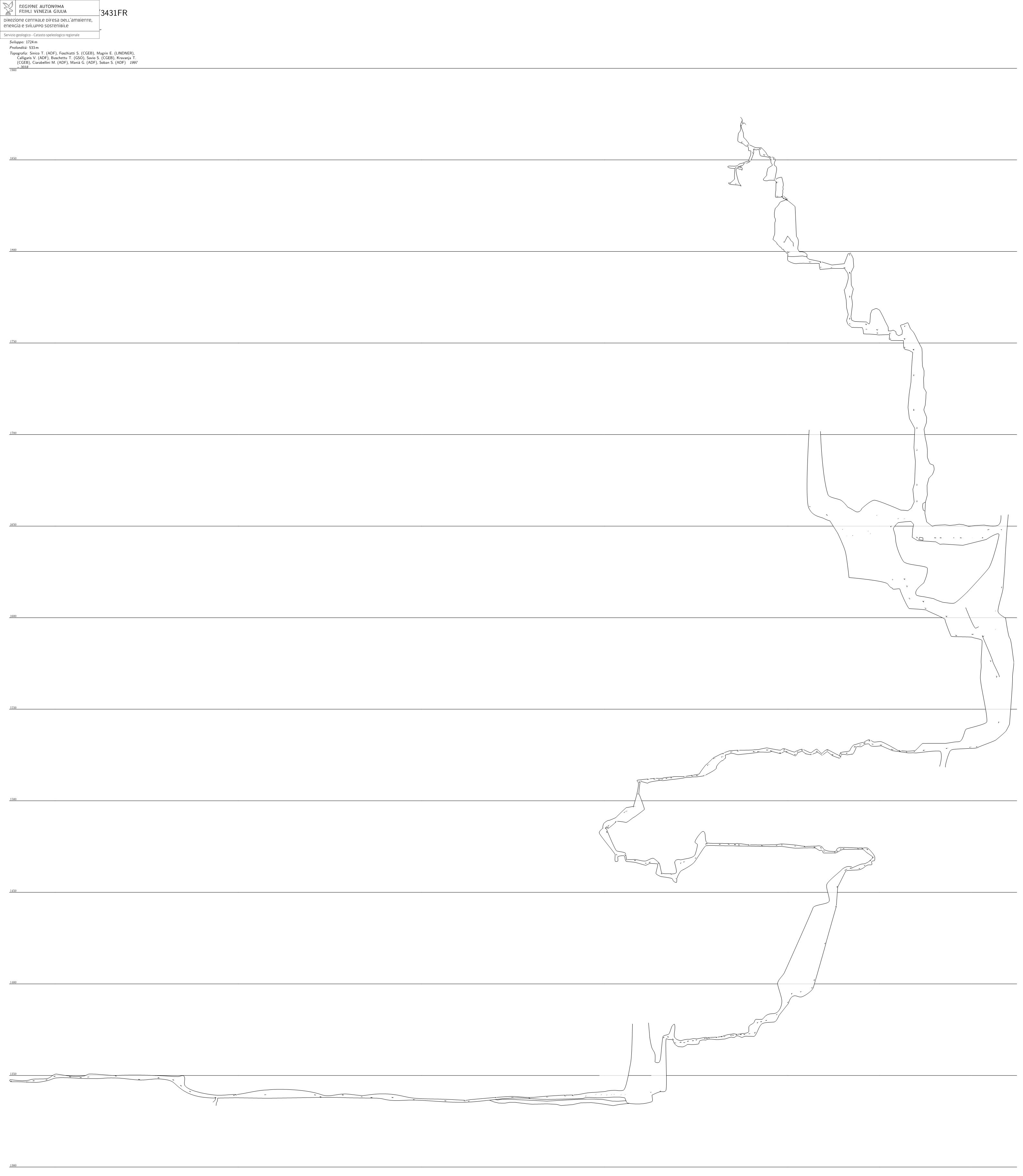 A -125 m (vedi rilievo) si arriva di fronte ad un passaggio stretto che immette nel pozzo “dei Mori” (P.100). Da qui gli ambienti cominciano ad essere sensibilmente più grandi, i pozzi più larghi e levigati dall’erosione dell’acqua. Alla base del P.100 parte un meandro (parzialmente da esplorare) e seguendo le corde si arriva su di un terrazzino che porta a un P.35 in zona fossile priva di acqua e con stillicidio quasi assente. Sopra al terrazzino parte un traverso che conduce in una nuova zona esplorativa dove si sta facendo una risalita (2022) per raggiungere tre arrivi posti a circa 30 m d’altezza. Alla base del P.35 ci si immette in una faglia non troppo stretta e con una serie di saltini e pozzetti si arriva su di un grande terrazzo di conglomerato che si affaccia sul pozzo che si può scendere anche in libera per i primi 20 m poi la verticale si appoggia fino alla sua base, ove ci si cala in uno stretto passaggio inclinato e si raggiunge il campo provvisorio a -350 m. Il campo si trova all’inizio di un meandro. Percorsi comodamente i primi metri il meandro si restringe diventando un misto di condottine frammentate da scomode strettoie per 150 m di sviluppo, di particolare interesse ametà di questo tratto la presenza di bellissime concrezioni, inusuali per la zona. Alla fine delle condotte ci si affaccia su di un pozzo che porta di nuovo in una faglia stretta.