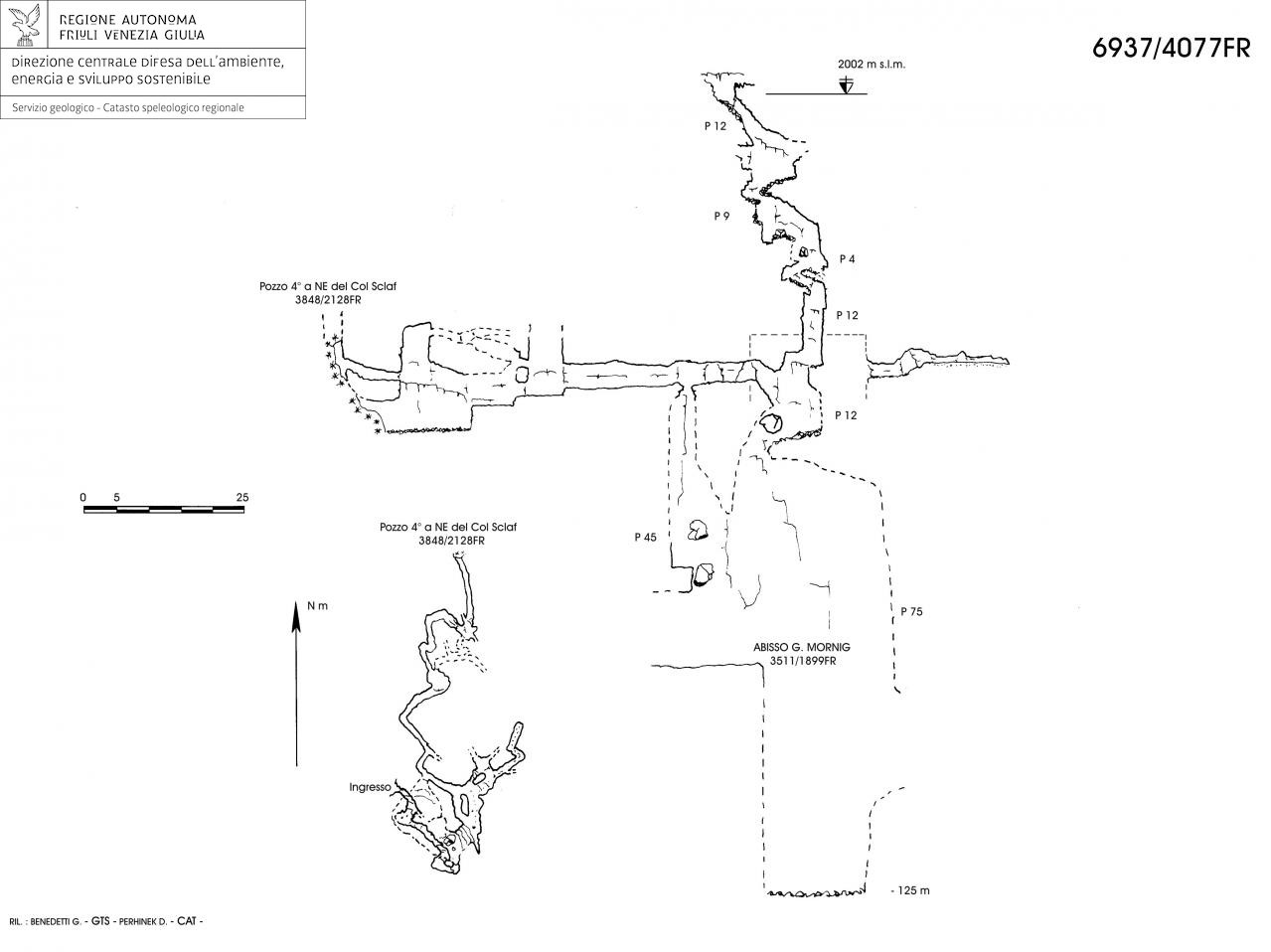 Si tratta di una cavità ad andamento misto. L'imbocco, dal quale in inverno fuoriesce una corrente d'aria calda, è stato aperto con lavori di scavo. Esso immette in uno scivolo franoso che poi si verticalizza. Seguono alcuni scivoli e pozzi intervallati da impegnative strettoie. Due pozzi da 12 metri abbastanza larghi conducono in una caverna con grossi massi di frana. Attraversando un passaggio sotto uno di questi si giunge sull'orlo di un ampio pozzo di circa 80 metri, sul cui fondo si trova la base del P40 (?) dell'Abisso Mornig 3511/1899FR. Dalla caverna tramite una risalita è possibile percorrere una serie di condotte e un meandro verso Nord. All'inizio di questo ultimo tramite un pozzo di 45 metri si ritorna nell'Abisso Mornig sopra il P40. Alla fine del meandro un deposito di neve impediva al momento dell'esplorazione il proseguimento. Qui si collega con il Pozzo 4° a NE del Col Sclaf (G7) (3848/2128FR).