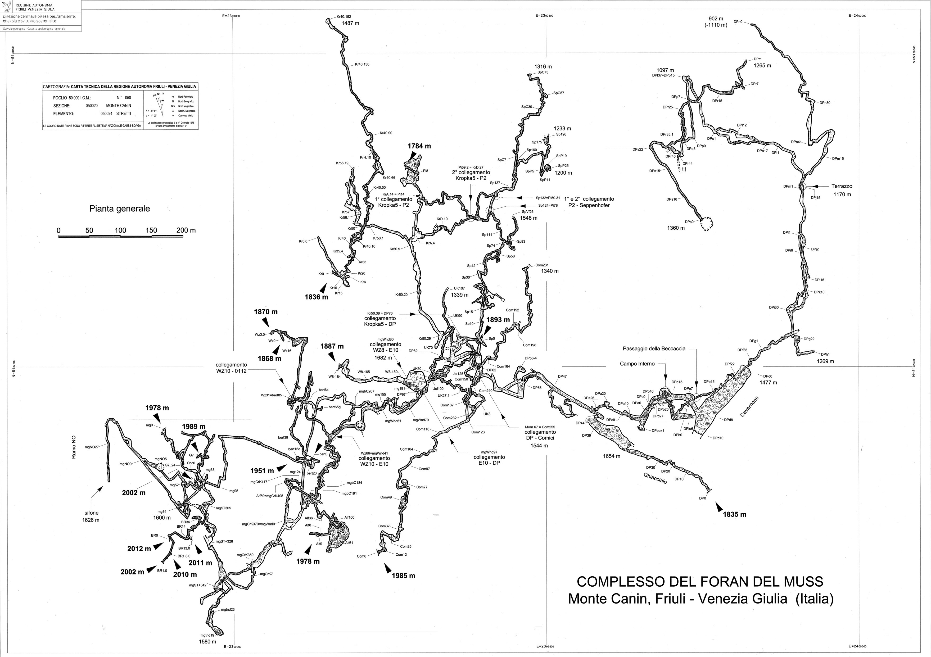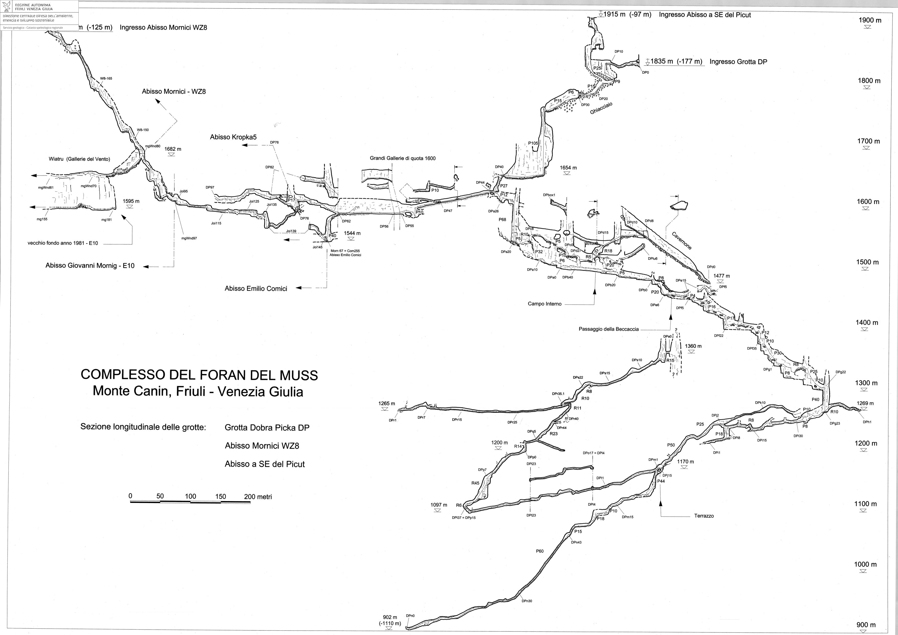 dal terrazzo a -574 le condotte freatiche attive sprofondano in un pozzo di 44 m cui seguono altre condotte molto ripide o quasi verticali Dopo aver superato una sequenza di scivoli molto inclinati tra i quali un P 60 si entra nella dolomia e dopo pochi metri un piccolo sifone segna il punto più profondo del Complesso a 902 m di quota sul livello del mare (marzo 2000)