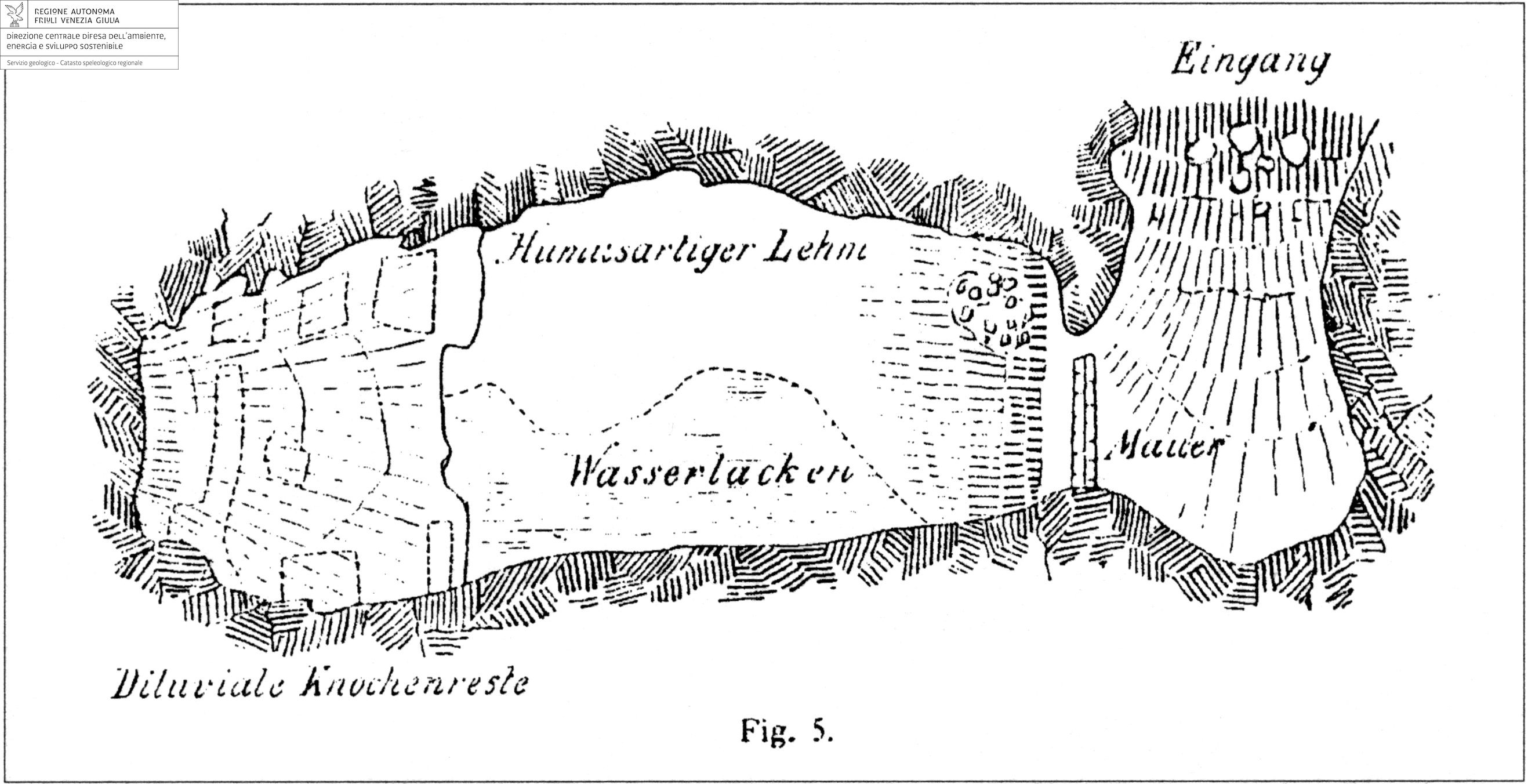 Nella relazione sugli scavi condotti negli anni dal 1889 al 1891 vengono citati anche quelli eseguiti nella caverna di Gabrovizza; le ricerche hanno permesso di portare alla luce manufatti in osso e corno, selci e numerosissimi molluschi marini.