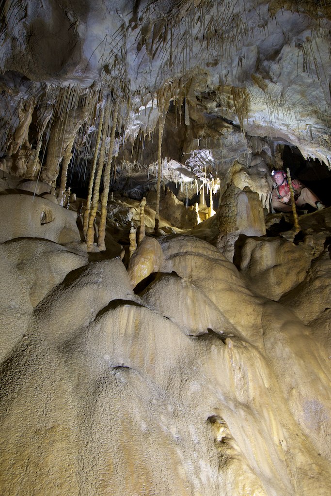 Alla base della colata si trovano due vaschette piene d'acqua che, dopo un lungo periodo di siccità, scomparsa l'acqua, permettono di raggiungere un passaggio che porta in un corridoio fangoso, il cui soffitto si abbassa fino ad una vasca colma d'acqua (Vasca da bagno).