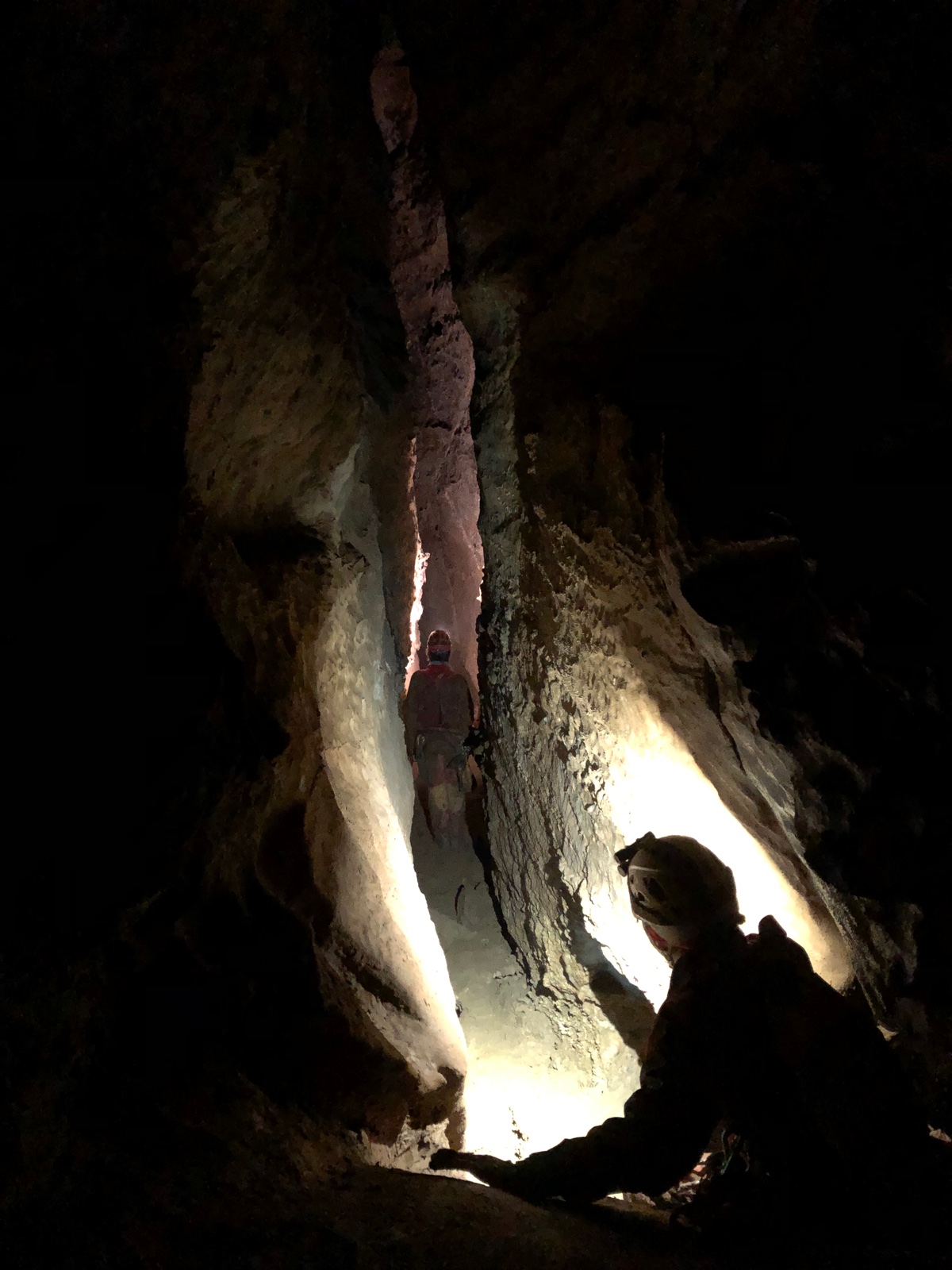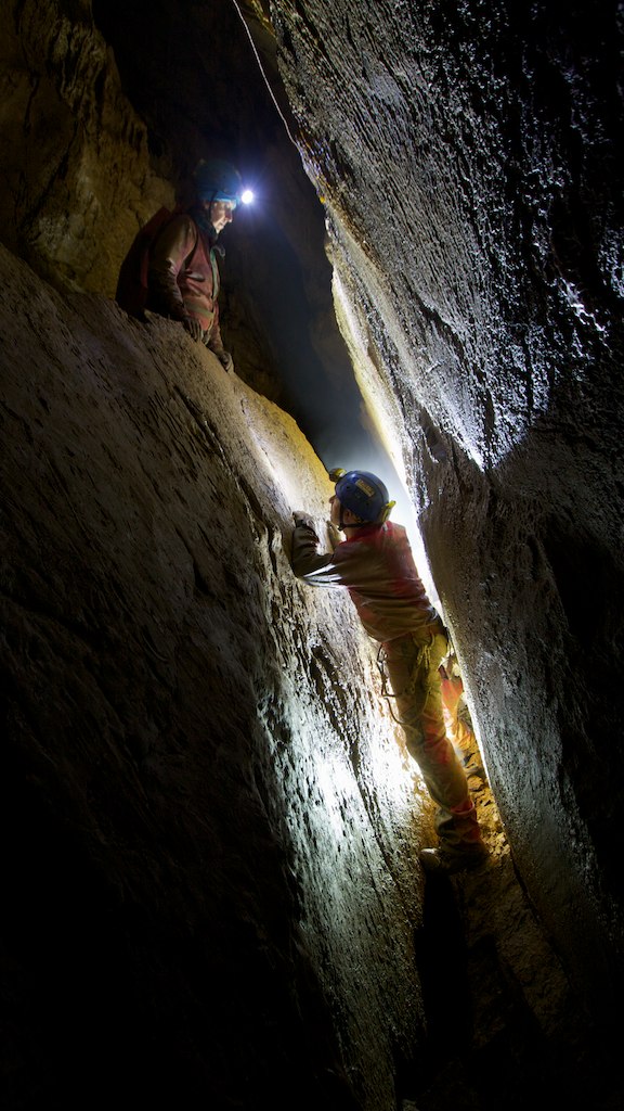 Tornando alla caverna (p.to 2 del rilievo), un passaggio basso porta direttamente alla base del precedente P7, da dove è possibile scendere uno sprofondamento di circa 8m che sbocca nella galleria principale, raggiungibile con una comoda arrampicata (p.to 4).