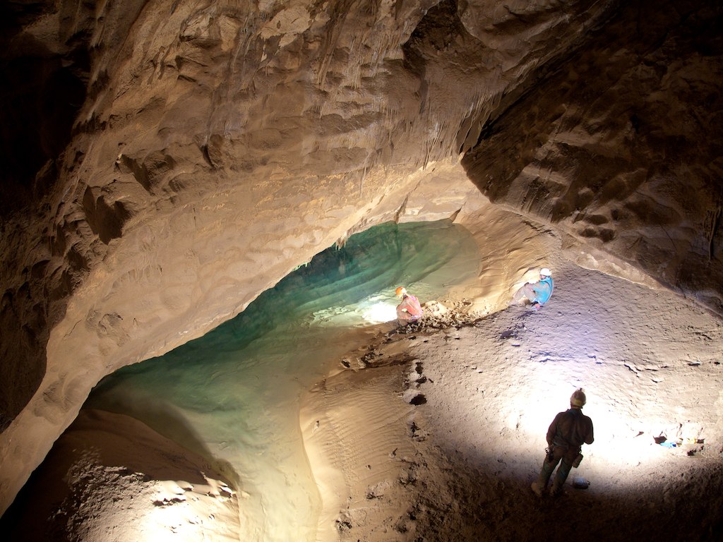 Proseguendo per un centinaio di metri lungo la direttrice principale, (scavalcato un P11 che si trova quasi all'inizio della galleria), una frana di grandi blocchi concrezionati sembra chiudere il meandro ma, dopo un'arrampicata di circa 6m, un passaggio sbocca alla sommità di una grande caverna ingombra di blocchi di crollo, alla cui estremità Nord si trova un lago (1º lago) profondo circa 6m (p.to 5 del rilievo).